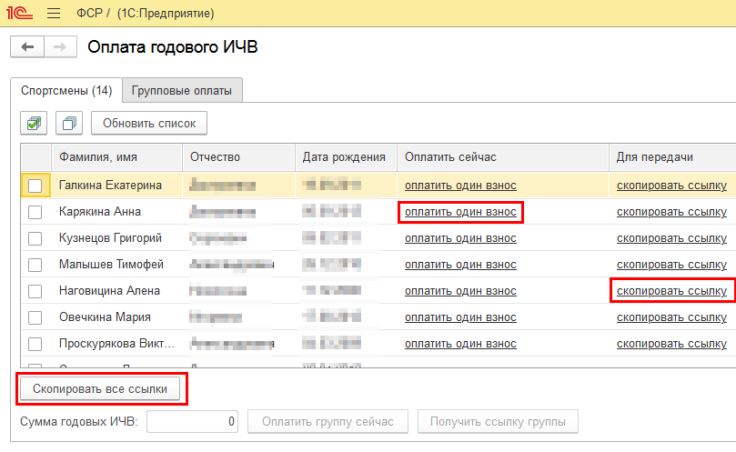 Если ссылку на оплату одного спортсмена нужно отправить спортсмену или его родителям, необходимо в строке спортсмена нажать на гиперссылку скопировать ссылку - в буфер обмена будет скопирована фамилия и индивидуальная ссылка спортсмена, далее ее можно вставить в письмо или в мессенджер для отправки.