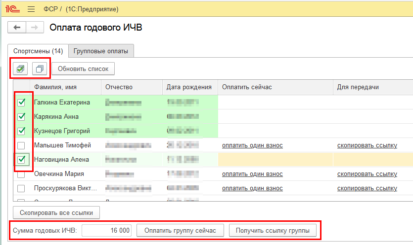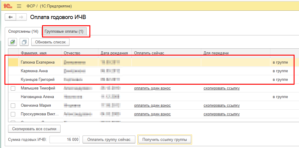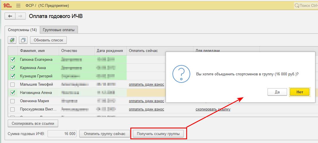 При нажатии на кнопку Получить ссылку группы можно объединить спортсменов в группу и скопировать ссылку на групповой платеж в буфер обмена, например, для отправки ответственному.