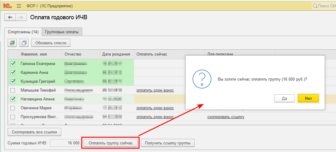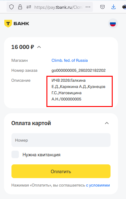 При нажатии на кнопку Оплатить группу сейчас можно объединить спортсменов в группу и сразу перейти на платежную форму банка для оплаты.