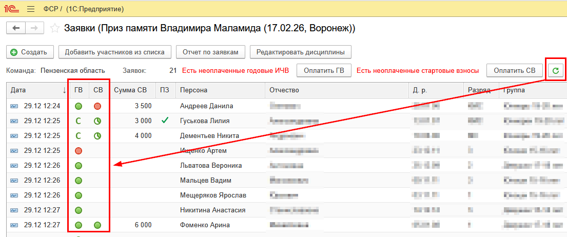 Статус оплаты годового взноса каждого спортсмена отображается в колонке ГВ списка: